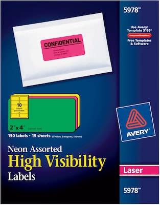 Amazon.com: avery labels Avery Shipping Address Labels, Laser & Inkjet Printers, 100 Labels, 2x4 Labels, Permanent Adhesive, TrueBlock (18163) ... Avery High-Visibility White 2.5 Round Labels, 300 Pack (5294) 4.8 out of 5 stars 6,370. $8.59 $ 8. 59 ($0.03/Count) $15.14 $15.14. Get it as soon as Wed, Jun 8. FREE Shipping on orders over $25 shipped by Amazon . More Buying Choices $8.16 (31 new … Label Printing & Shipping | Label Outfitters High Visibility Neon Labels, Rectangular 2 5/8" x 1" Address Sized, Five Assorted Colors! Green, Orange, Pink, Red & Yellow! 20 Sheets Each - 100 Sheets Total (1) $23.97. Add To Cart. Quick View. 1,000 Label Outfitters® Fluorescent Neon Green LASER ONLY 4 x 2 Labels use Avery® 5163, Compulabel® 312142 Template 100 Sheets (7) $21.97. Add To Cart. Quick … Avery Labels | Staples Buy Avery Labels at Staples and get free shipping on qualifying orders. ... Avery High Visibility Laser Shipping Labels, 2.5"Dia., White, 300/Pack (5294) Avery 06482, High Visibility Laser Labels, 3 1/3 x 4, Assorted Neon, 72 ... Avery 2-1/2in dia High-Visibility Round Laser Labels- White (300 per Pack) $4.99 Avery 5 1/2" x 8 1/2" 20ct Internet Shipping Labels - White $10.99 Avery 1 x 2-5/8 High-Visibility Laser Labels- Neon Magenta (750 per Pack) $11.23 Avery Laser Color Coding Labels 1 1/4" Dia. Neon Green 8/Sheet 13291 Sale: $10.37 reg $11.02 Reg: $11.02
