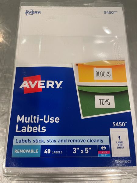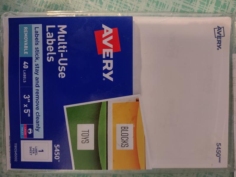Avery® 5450 3" x 5" White Rectangular Removable Write-On / Printable ... Easily organize projects, files, and inventory with the Avery® 5450 3" x 5" white rectangular removable write-on / printable labels. Perfect for labeling boxes, envelopes, folders, and packages, this 3" x 5" white rectangular label is a multi-purpose addition to your office supplies. Thanks to the write-on / printable design, you can quickly hand write names, dates, or text right on the ...